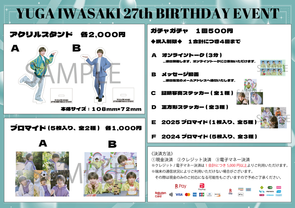 YUGA IWASAKI 27th BIRTHDAY EVENT グッズ公開! NEWS 岩崎悠雅Official Site 2025/03/16 18:00 フォロー YUGA IWASAKI 27th BIRTHDAY EVENTにて販売する、グッズを公開! 昨年販売したグッズも販売!•アクリルスタンド(全2種) 各2,000円•アクリルキーホルダー 1,000円•ステッカー(3枚セット) 500円 この機会に是非ご利用ください!! URLをコピーする 報告する